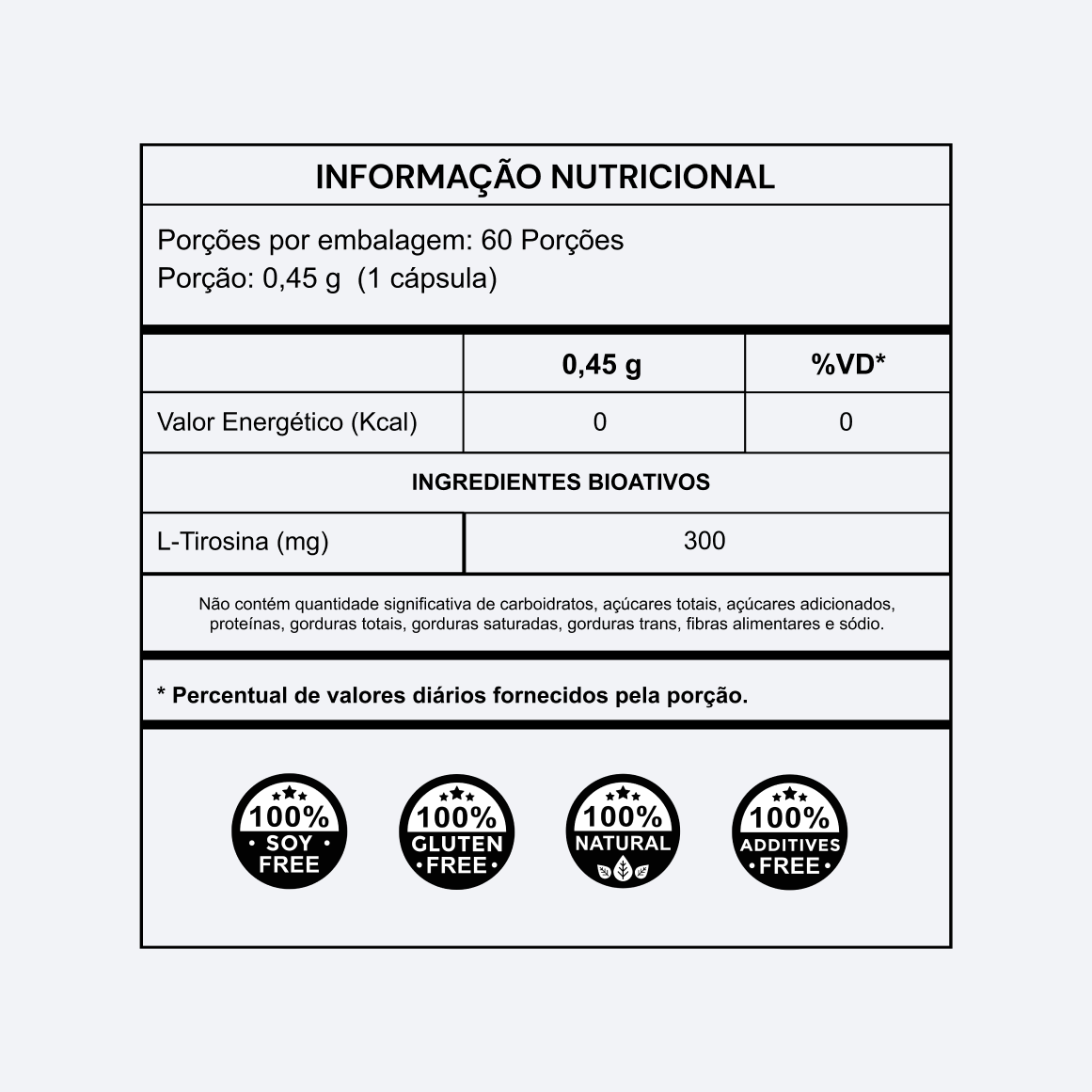 L-tirosina, dióxido de silício, estearato de magnésio e carbonato de cálcio. CÁPSULAS: Gelatina, opacificante dióxido de titânio (INS 171) e água purificada.NÃO CONTÉM GLÚTEN.