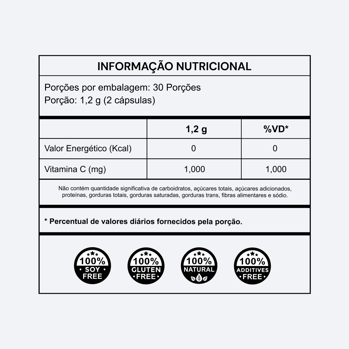 Vitamina C (ácido ascórbico). CÁPSULAS: gelatina, opacificante dióxido de titânio (INS 171) e água purificada. NÃO CONTÉM GLÚTEN.