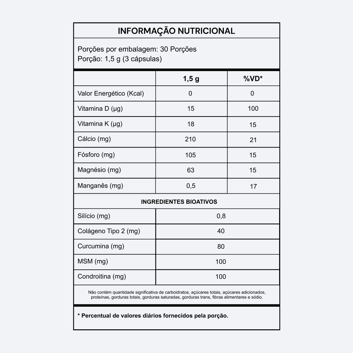 - Contém uma poderosa combinação de cúrcumina, condroitina, colágeno, vitaminas e minerais essenciais para a saúde das articulações e